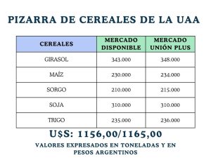 Compartimos los precios de la pizarra de cereales de la Unión Agrícola de Avellaneda, con valores actualizados al cierre del día de la fecha:
