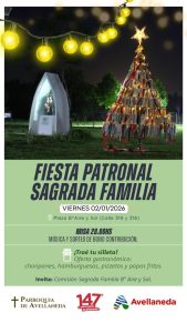 La Municipalidad de Avellaneda recuerda a la comunidad que este viernes 2 de enero se llevará a cabo la Fiesta Patronal de la Sagrada Familia en el B° Aire y Sol.