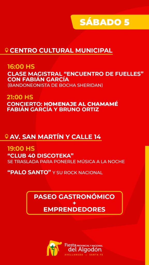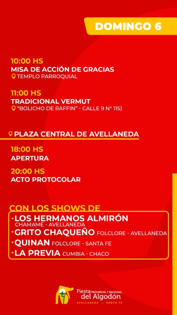 “Todo es libre y gratuito, para toda la familia, con opciones para chicos y grandes. Tenemos muchos emprendedores que confían en la fiesta. Invitamos a todas las familias de la región. Para el acto central habrá representación provincial, hay posibilidades de que venga el gobernador Pullaro”.