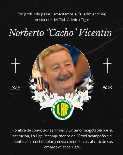 La Liga Reconquistense de Fútbol expresa su profundo pesar por el fallecimiento de Norberto “Cacho” Vicentín, presidente del Club Atlético Tigre Avellaneda, quien partió a los 64 años.