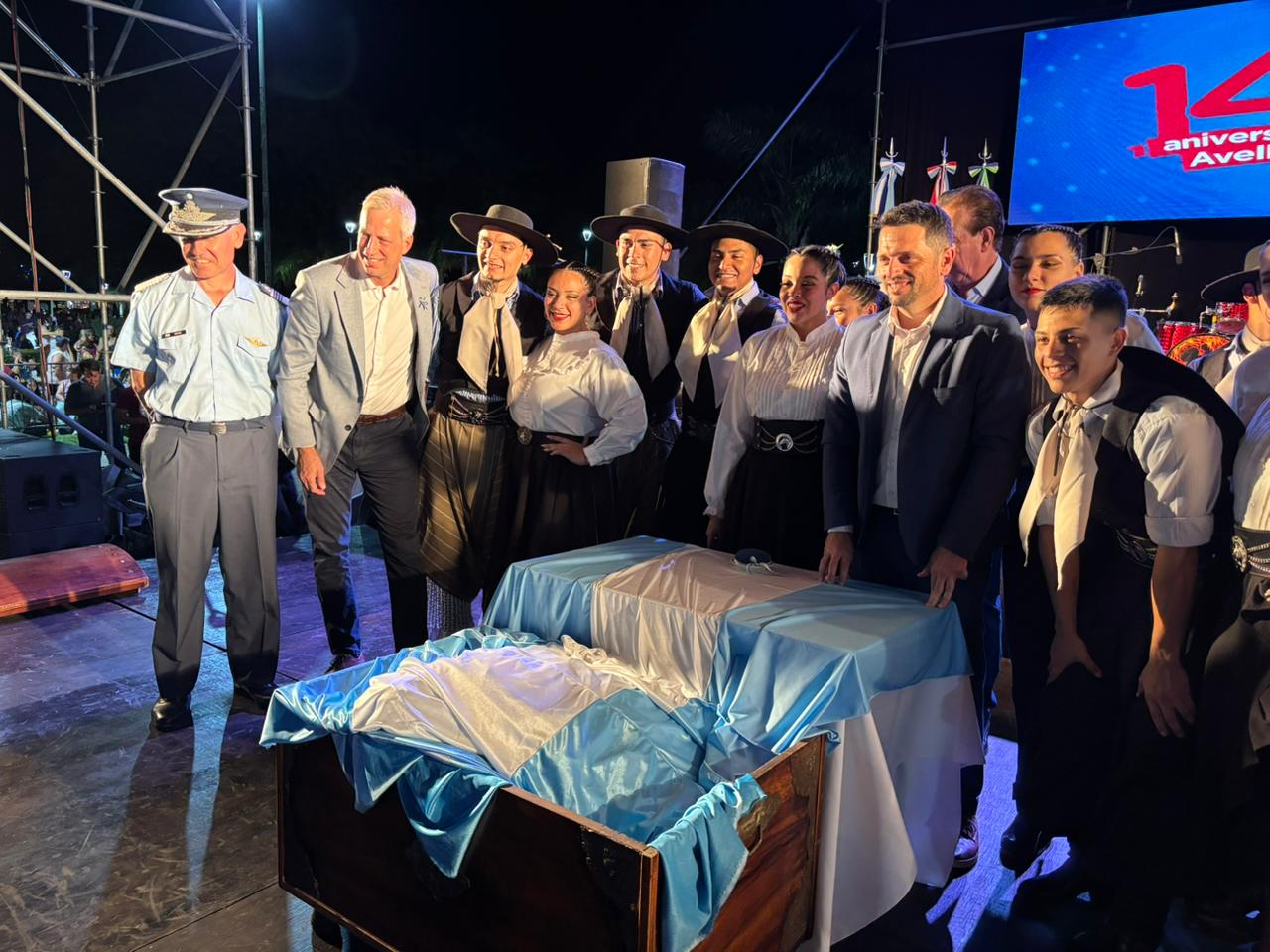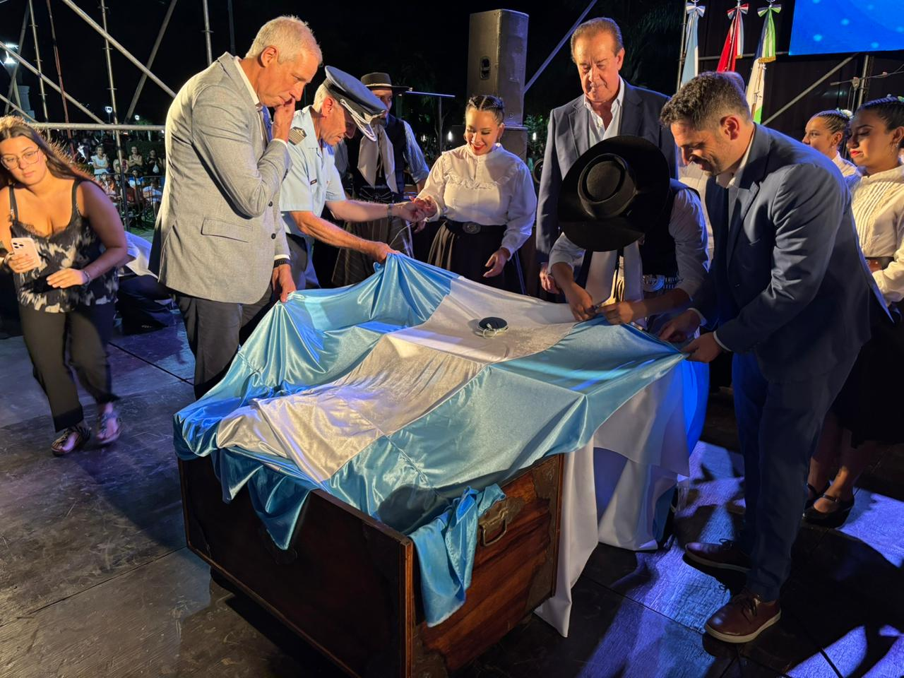 Tras la entonación del Himno Nacional Argentino, se desarrolló uno de los momentos más simbólicos del aniversario: la ceremonia de traslado de la gran bandera nacional. En esta edición, el paño número 147 fue incorporado por el intendente junto a la Compañía Municipal de Danzas, destacando el rol de la cultura como expresión identitaria y el aporte permanente de sus integrantes a la vida comunitaria.