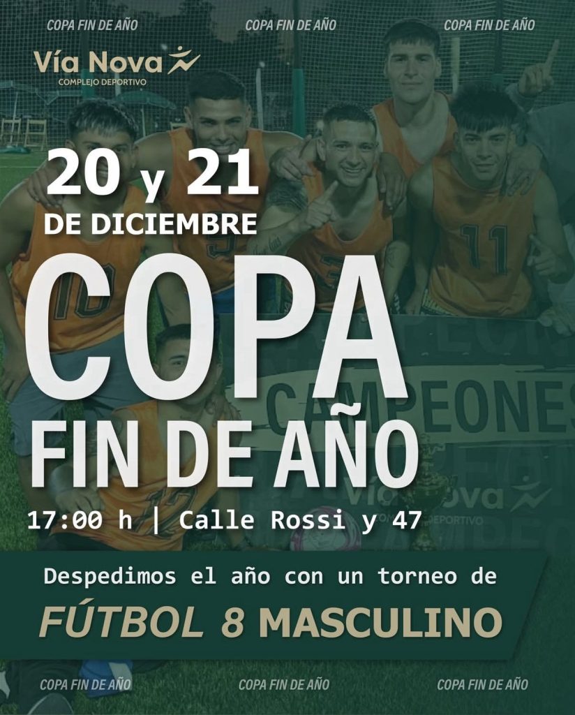 Vía Nova se prepara para cerrar el año con una gran propuesta deportiva que promete convocar a jugadores y familias de toda la región. La Copa Fin de Año se desarrollará los días 20 y 21 de diciembre, con un torneo de Fútbol 8 masculino que reunirá a 16 equipos y repartirá más de $1.250.000 en premios.