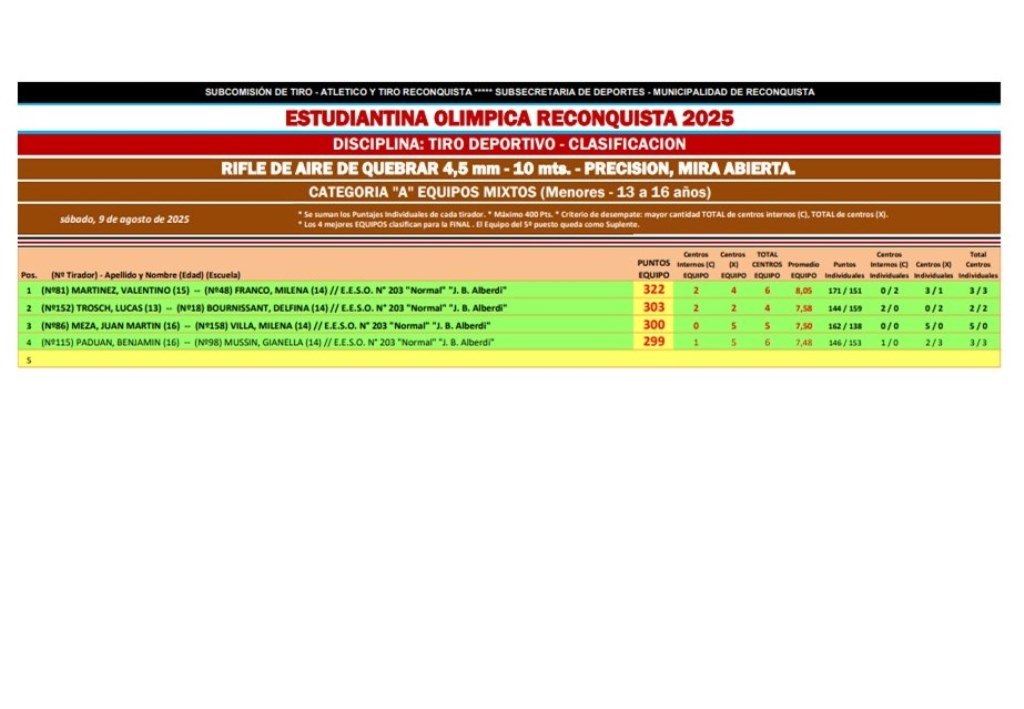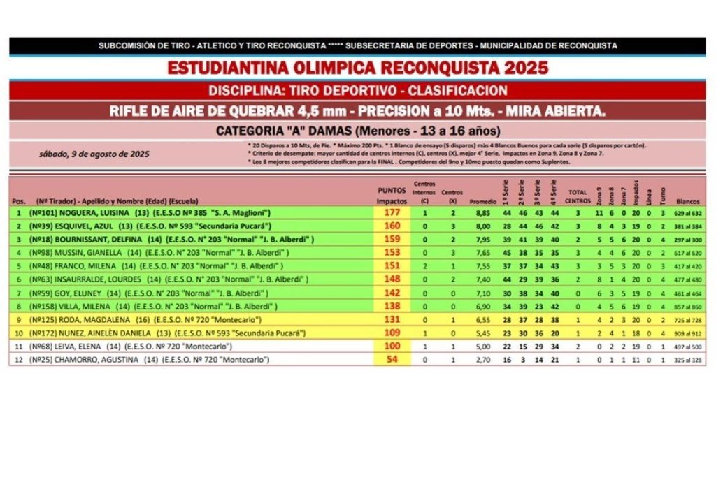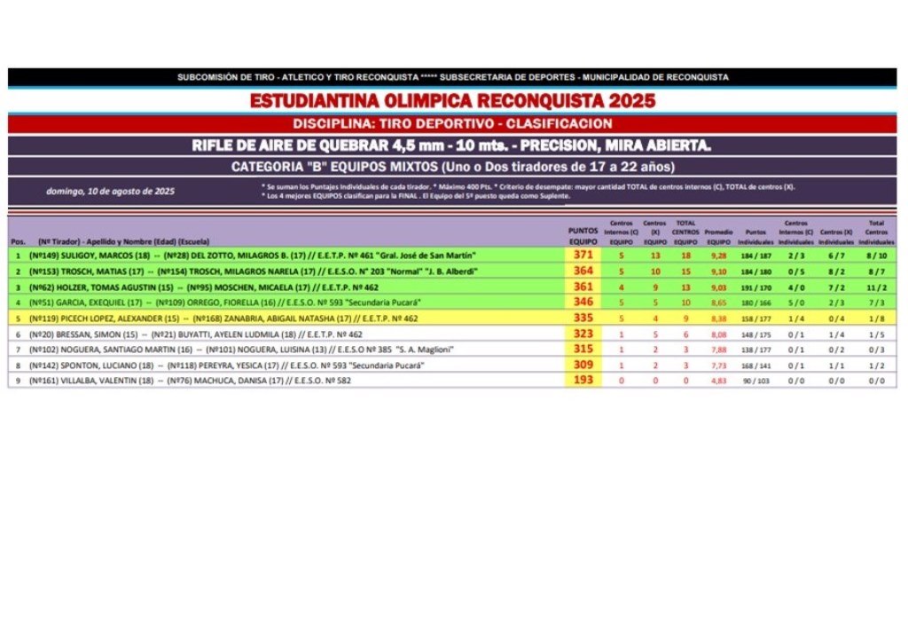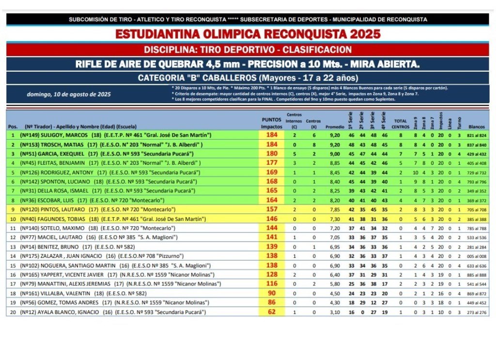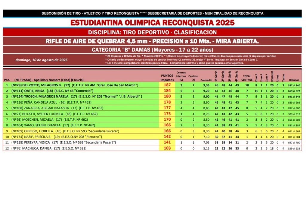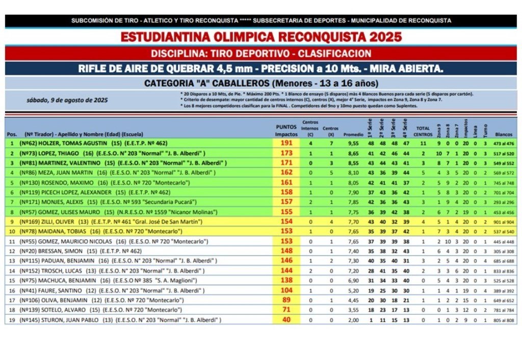 Este sábado 9 y domingo 10 de agosto se cumplió tal cual estaba previsto con la etapa de clasificación para participar de la disciplina Tiro Deportivo en la Estudiantina Olimpica Reconquista 2025. El sábado 9 tiraron los de Categoria Menores (Sub 16) y el domingo 10 competieron los de la Categoria Mayores (17 años en adelante).