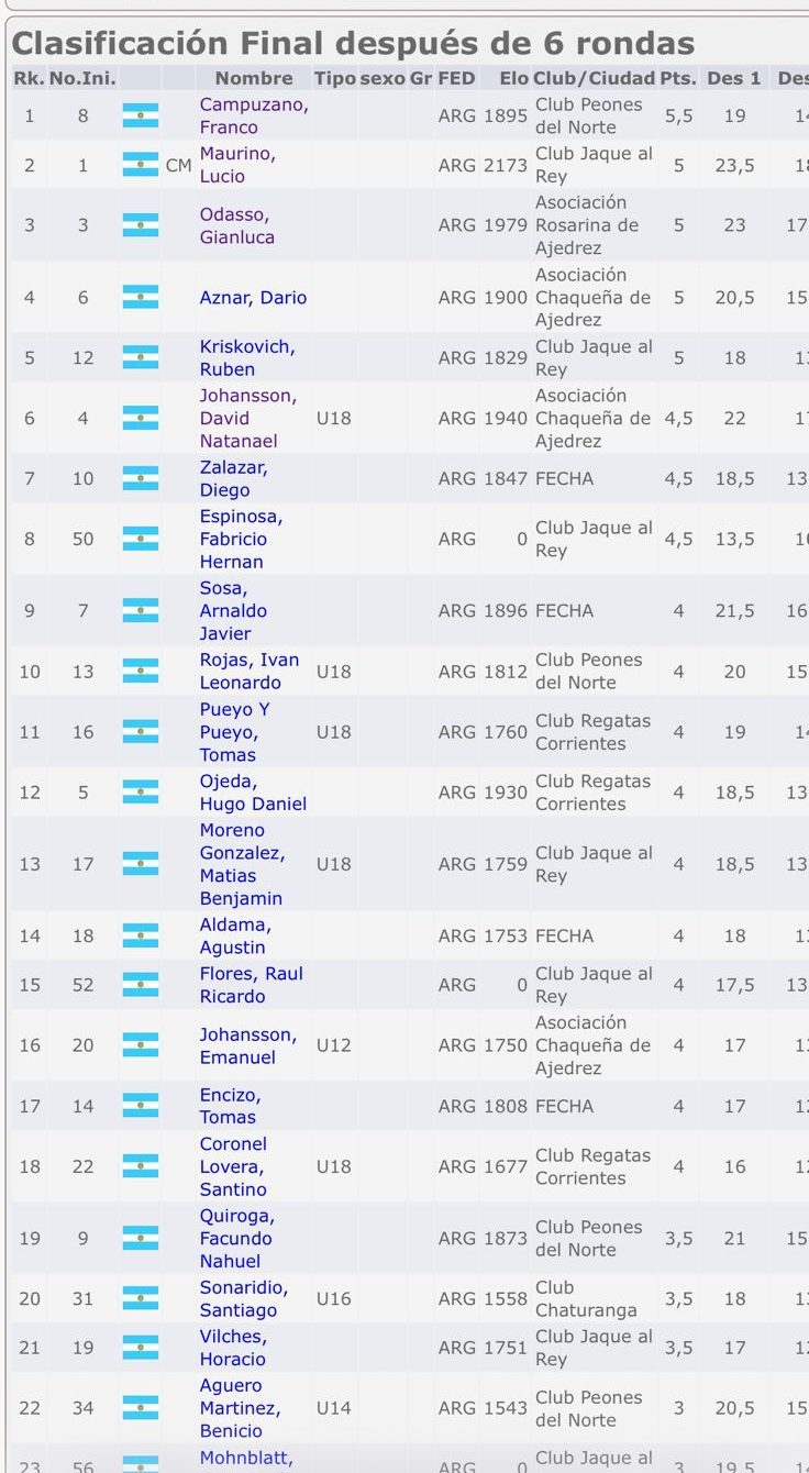 Fue tercero el representante de la Asociación Rosarina de Ajedrez Gianluca Odasso, con 5 puntos sobre 6 posibles. El campeón invicto del torneo fue el formoseño Franco Campuzano (5.5/6 puntos) y en segundo lugar quedó el C.M Lucio Maurino (5 de 6 puntos).