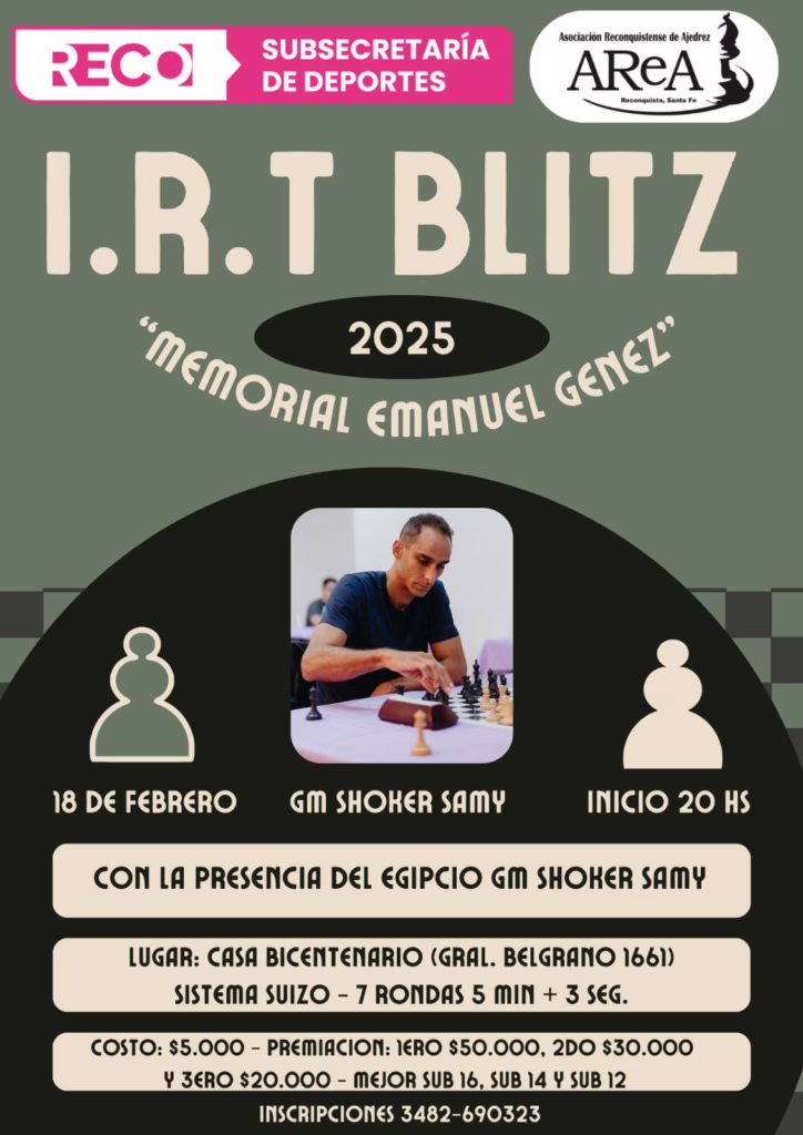 Finalmente, el martes 18 de febrero, Shoker será el gran atractivo del IRT Blitz “Memorial Emanuel Genez”, torneo valido al Ranking Internacional y que se disputará a 7 rondas con un ritmo de 5 minutos + 3 segundos de incremento por jugada.