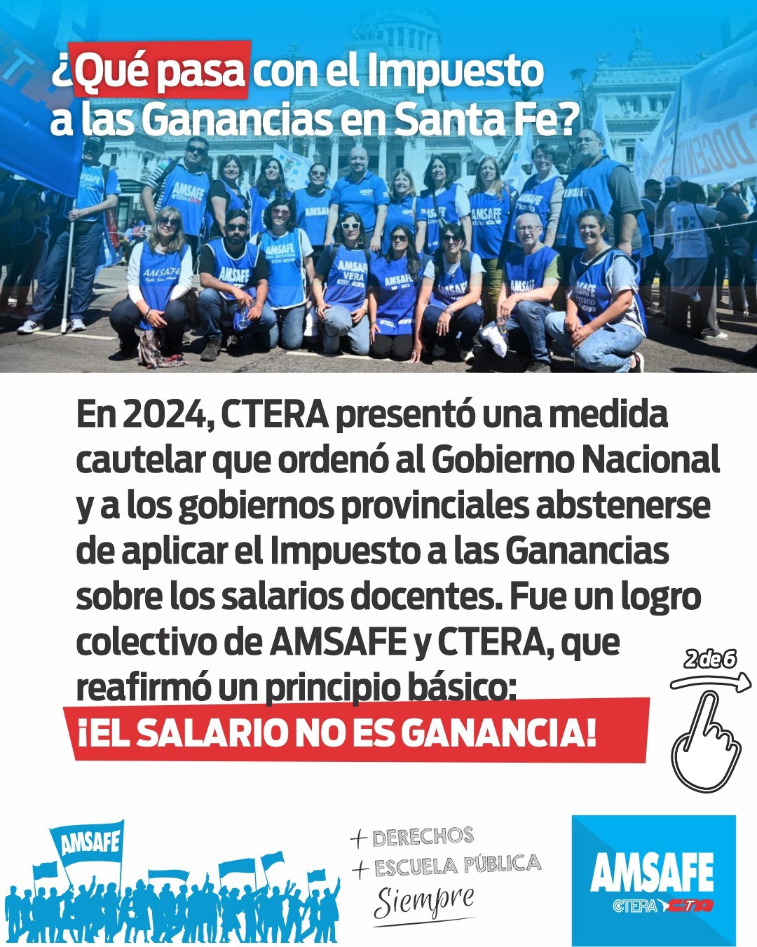 AMSAFE informa que, tras más de un año sin descuentos por Impuesto a las Ganancias gracias a la medida cautelar obtenida por CTERA en 2024 -que ordenaba al Gobierno nacional y a los gobiernos provinciales abstenerse de aplicar este tributo sobre los salarios docentes bajo el principio de que el salario no es ganancia-, la situación ha cambiado de manera regresiva para el sector.