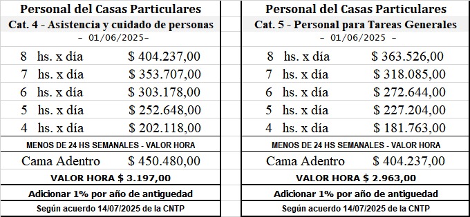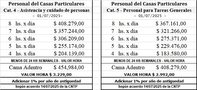 Dieron a conocer la escala salarial personal de casas particulares de los meses de Junio y Julio, y aclaración de las sumas no remunerativas a abonar en Julio, Agosto y Setiembre, Según acuerdo 14/07/2025 de la CNTP.