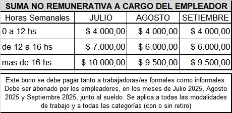Pagos no remunerativos por única vez en esos mismos meses, según la carga horaria semanal.