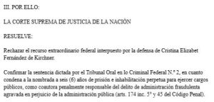 El máximo órgano de justicia de la nación no hizo lugar a los recursos de queja que presentara la ex mandataria. De esta manera, quedan firmes los fallos de los tribunales inferiores. La Cámara de Casación había determinado 6 años de prisión e inhabilitación de por vida para ejercer cargos públicos. Cristina puede solicitar el cumplimiento de la prisión en forma domiciliaria por cuanto tiene más de 70 años.