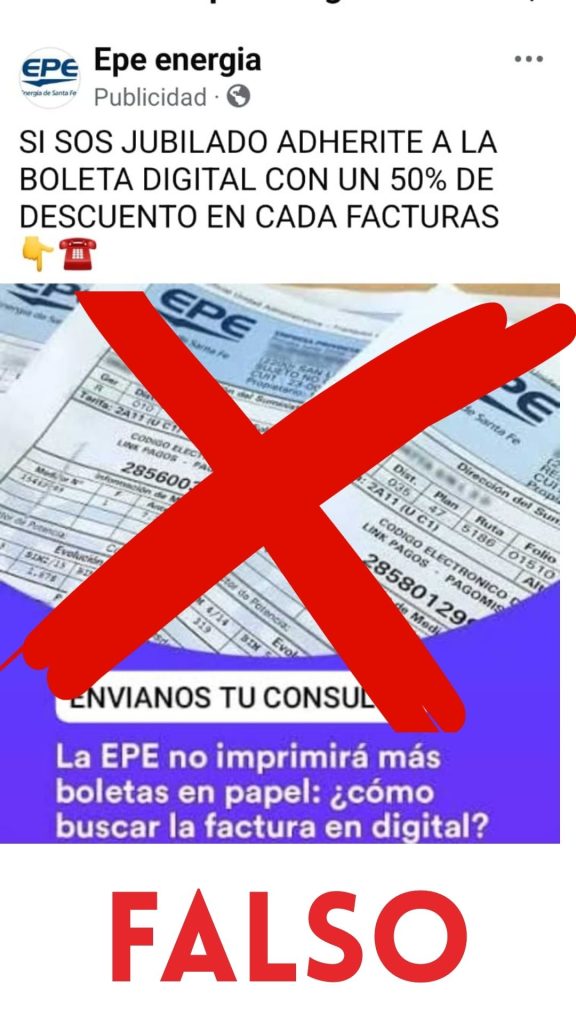 La Empresa Provincial de la Energía (EPE) salió a desmentir una información falsa que circula en redes sociales y mensajes de WhatsApp, en la que se asegura que los jubilados pueden acceder a un 50% de descuento en cada factura si se adhieren a la Boleta Digital.