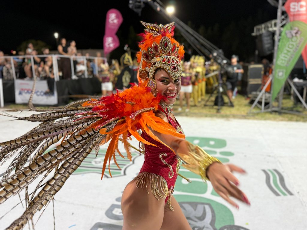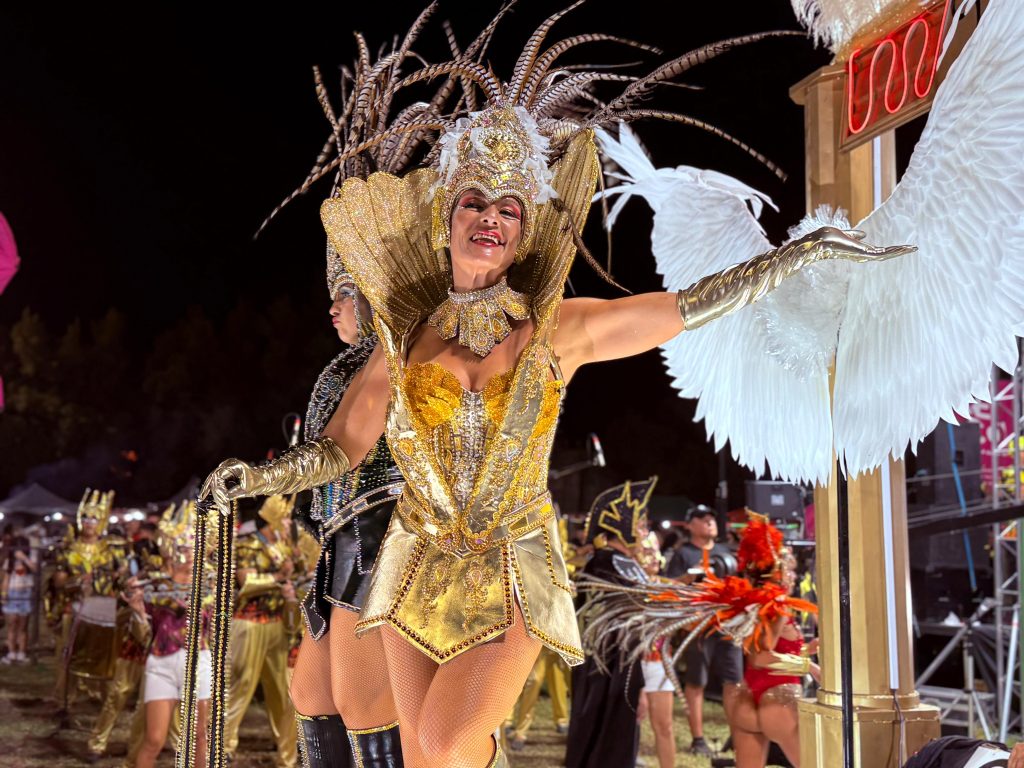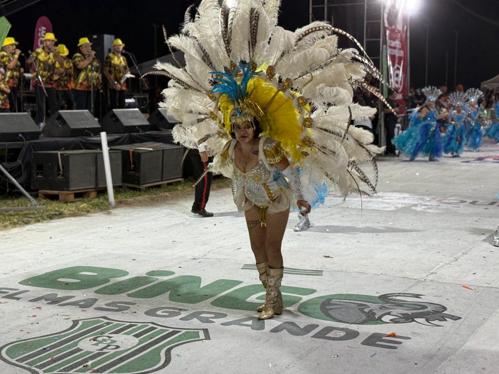 O’Bahía presentó “Enredate con O’Bahía”, una propuesta inspirada en el universo digital, las redes sociales y la hiperconectividad. Con cerca de 110 integrantes, la comparsa realizó un recorrido escénico por la evolución de las plataformas tecnológicas, personificando aplicaciones y conceptos clave del mundo virtual. La fibra óptica tuvo su representación en la figura de su reina, Fiama Agustini.