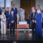 Durante el acto, el gobernador, el presidente de la Convención y los integrantes del bloque Frente de la Esperanza -Verónica Colombo, Caren Früh y Ariel Sclafani- entregaron una placa honorífica a los familiares de la convencional electa Alejandra “Locomotora” Oliveras, recibida por sus hijos Alejandro y Alexis.