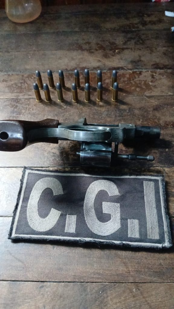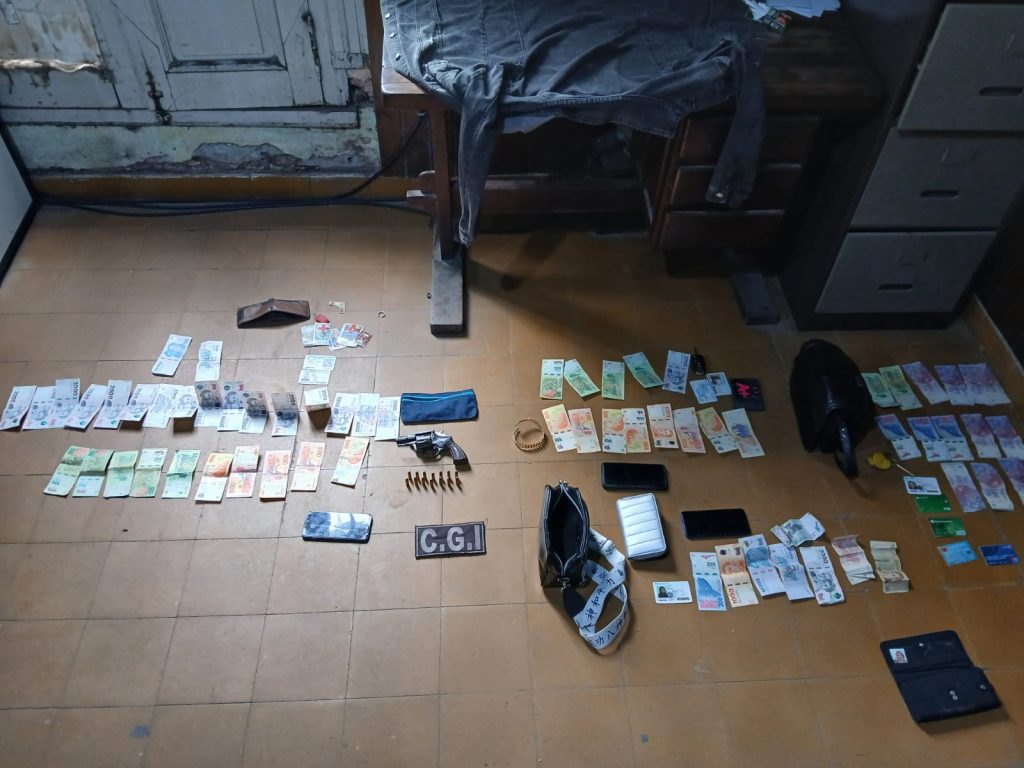 En presencia de dos testigos, se procedió a una requisa, donde se encontró una cartuchera de tela en poder de una de las ocupantes. Dentro de esta se halló un revólver marca DV MR, N° de serie 6416, con 14 cartuchos intactos y su tambor vacío.