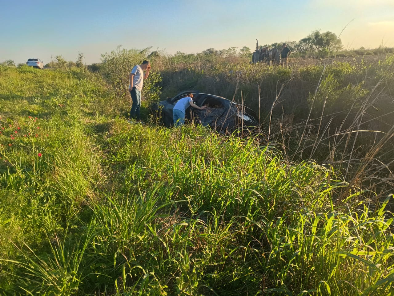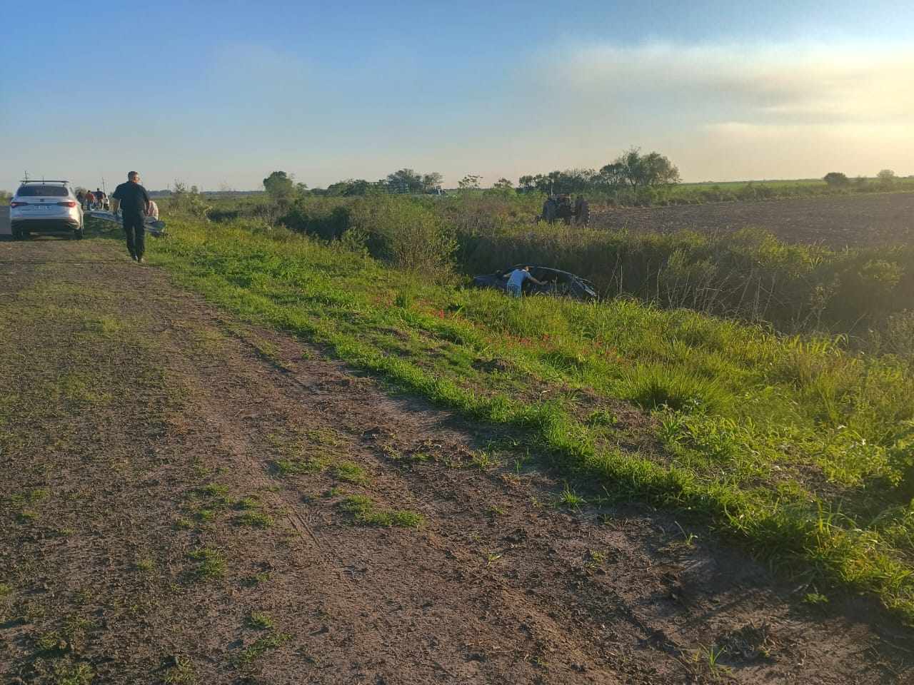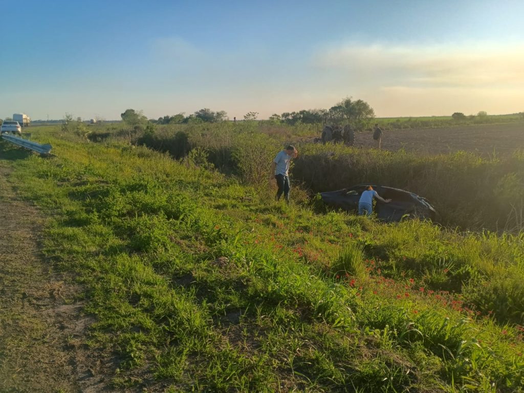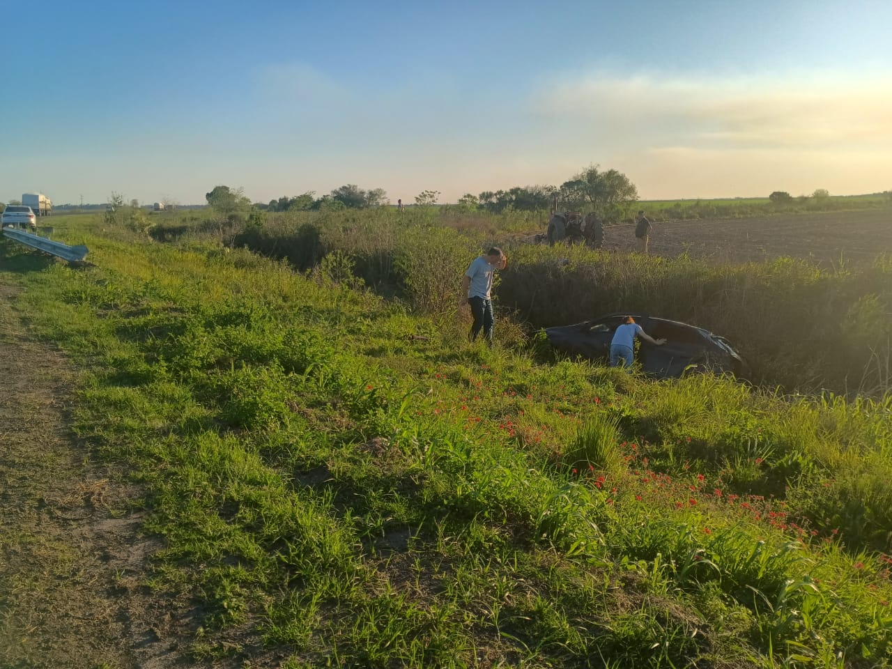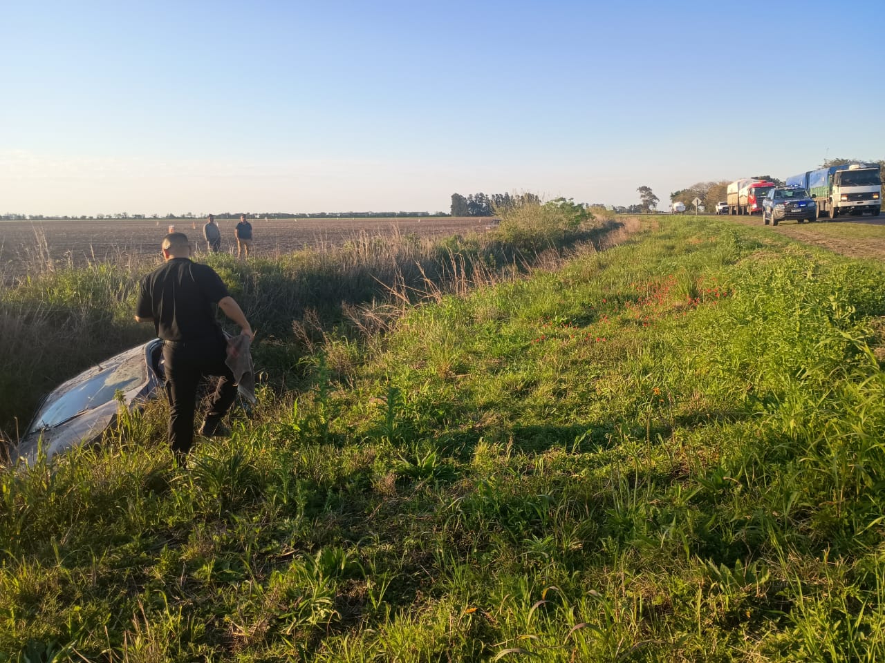 Al llegar al lugar, observan un vehículo Chevrolet Onix color gris volcado en la banquina en el lado Oeste de la ruta.