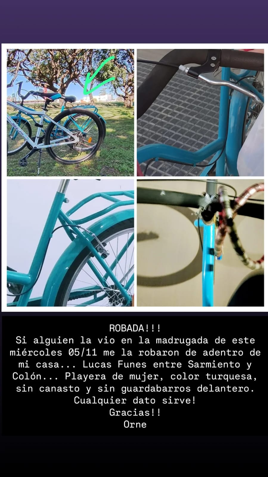“Si alguien la vio en la madrugada de este miércoles 05/11, me la robaron de adentro de mi casa… Cualquier dato sirve. Gracias!”, escribió. Se trata de una playera de mujer, color turquesa, sin canasto y sin guardabarros delantero.