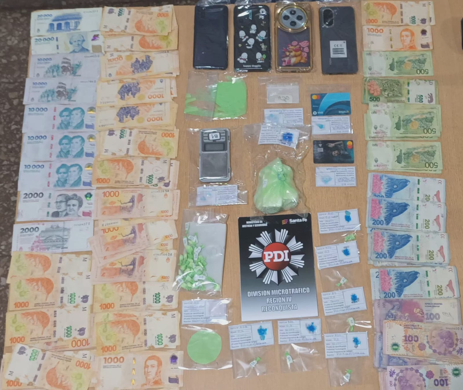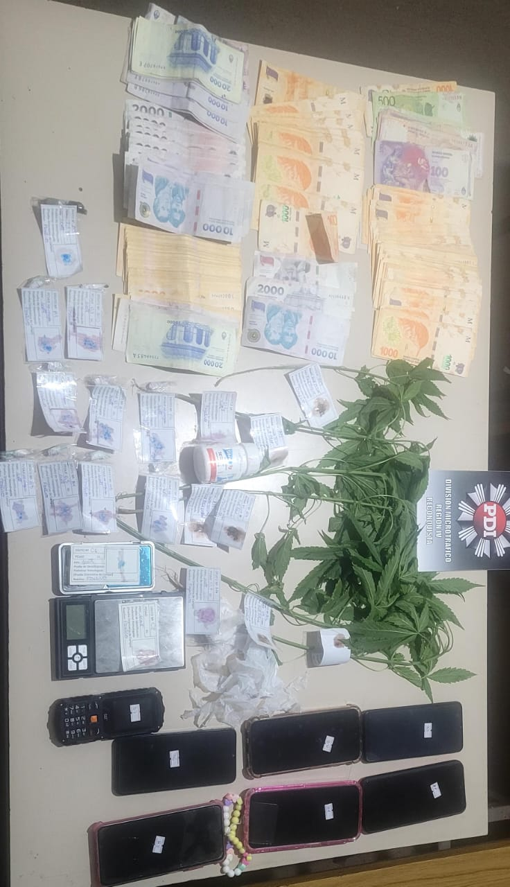 En el primer domicilio se incautó un trozo compacto y 33 fracciones de cocaína, con un peso total de 313,1 gramos, junto a cuatro teléfonos celulares, una balanza de precisión, $197.460 en efectivo y elementos de corte. En la segunda vivienda se encontraron 10 envoltorios con cocaína (3 gramos), dos balanzas, recortes de nailon, siete teléfonos celulares y $477.900 en efectivo, además de seis plantines de marihuana.