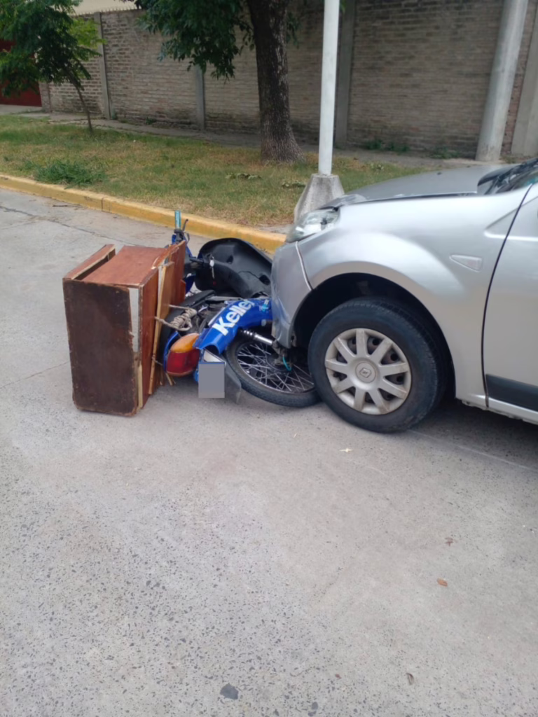 Por causas que se tratan de establecer, entraron en colisión una motocicleta marca Keller Cronos, color azul, guiada por Melgarejo Damian de 20 años, y un automóvil marca Renault Sandero, color gris, conducido por Mazzuchin Mariela de 56 años, domiciliada en Barrio América Pasaje 6/8.