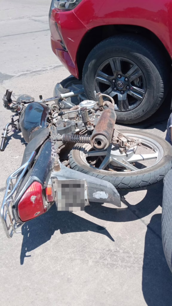 Por causas que se tratan de establecer, entraron en colisión una Camioneta Toyota Hilux 4×4 conducida por LUCIA MARCONI ROBLES de 43 años, domiciliada en calle Fray Antonio Rossi y la motocicleta Marca Honda 125 cc, conducida por MARAN ABEL de 33 años, domiciliado en B° America Calle 58, quien iba acompañado por LEIVA GISELA.