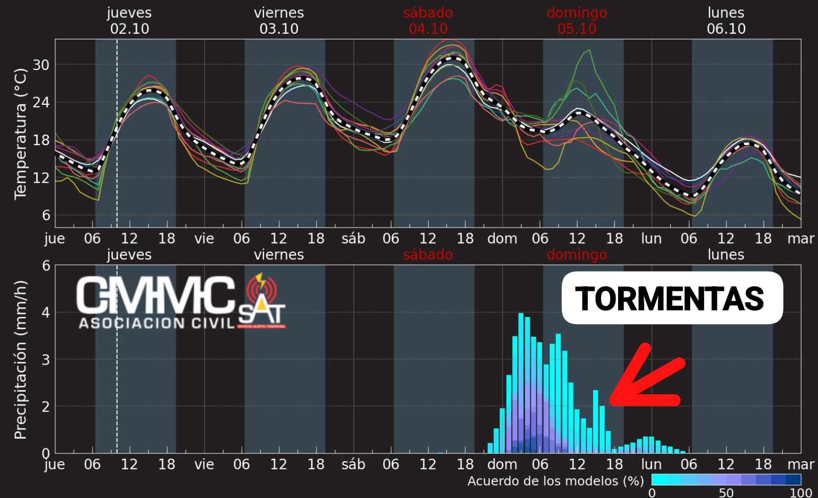 🔺 Recomendación: se sugiere un seguimiento atento de la evolución meteorológica entre la noche del sábado y el transcurso del domingo, debido a la probabilidad de fenómenos fuertes.