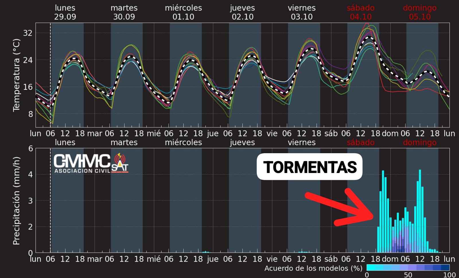 Además, se esperan neblinas/bancos de niebla matinales. Desde la tarde/noche del sábado se anticipa un incremento de la nubosidad con condiciones de inestabilidad. La rotación del viento al sector sur podría favorecer el desarrollo de tormentas, algunas localmente fuertes, entre la noche del sábado y parte del domingo.