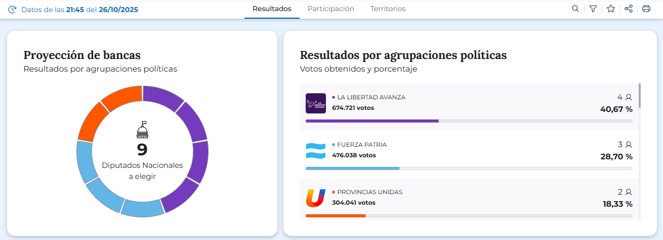 De esta manera, y según la proyección oficial de bancas, LLA obtiene 4 de los 9 escaños en disputa para la Cámara de Diputados de la Nación; Fuerza Patria suma 3, y Provincias Unidas se queda con las 2 restantes.