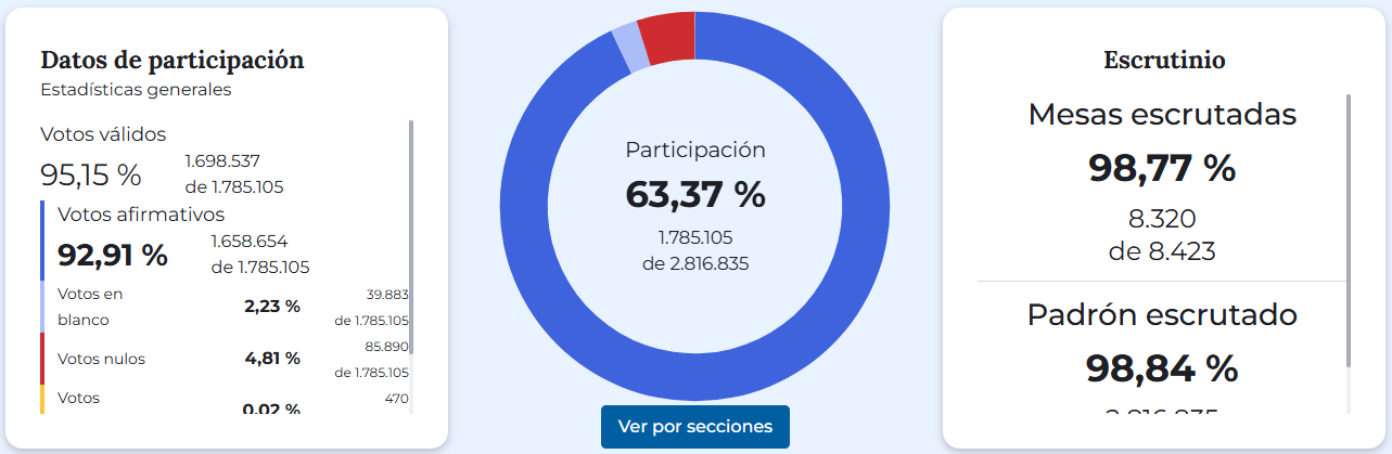 En total, se registraron 1.785.105 votos emitidos, de los cuales 1.698.537 fueron válidos (95,15%). Los votos afirmativos alcanzaron el 92,91%, mientras que los votos en blanco representaron el 2,23% y los nulos el 4,81%.