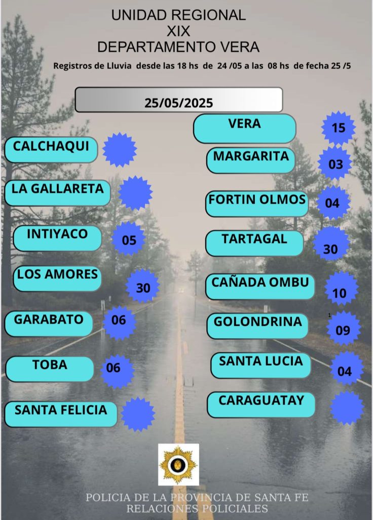 Como parte del monitoreo, se enviaron datos de lluvia registrados en el Departamento Vera, correspondientes al periodo comprendido entre las 18:00 horas del 24 de mayo y las 08:00 horas del día de hoy (se adjunta imagen).