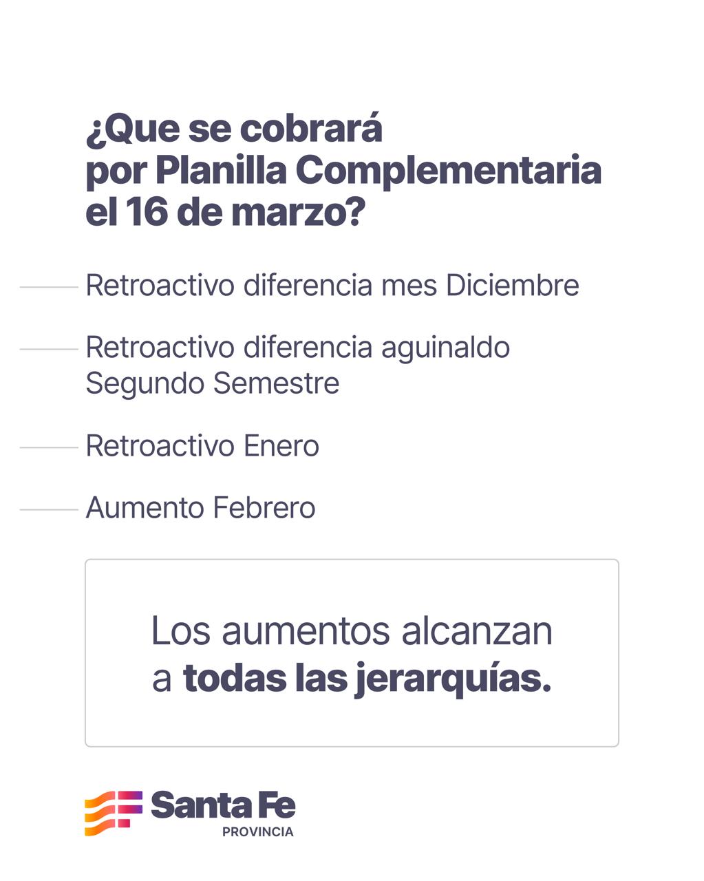 Así, la funcionaria detalló que el próximo 16 de marzo encontrarán en el pago por planilla complementaria “el retroactivo de la diferencia del mes de diciembre 2025; el retroactivo de la diferencia del aguinaldo del segundo semestre 2025; el retroactivo del mes de enero y el aumento de febrero”, a lo que sumó que “las diferencias establecidas para los meses subsiguientes, serán liquidadas consecuentemente con el sueldo de bolsillo que cada agente de seguridad percibirá en el transcurso de los próximos meses”.
