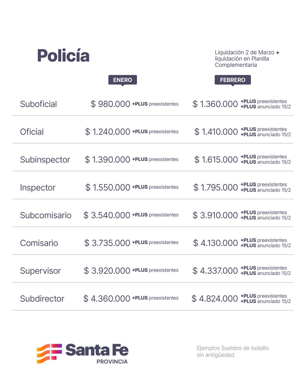 Seguidamente, Orciani utilizó algunos ejemplos para mostrar los aumentos anunciados en paritaria de febrero para la Policía y el Servicio Penitenciario: “Un suboficial de Policía que recién ingresa a la fuerza en enero cobró $ 980.000 más los plus preexistentes, mientras que en febrero percibió $ 1.360.000 y percibirá los plus preexistentes más los plus que se originan en virtud de los anuncios del gobernador Maximiliano Pullaro (el pasado 15/02), es decir, el plus operativo de calle y el plus de chofer”. En tanto que un subdirector de Policía que en enero cobró $ 4.360.000 más los plus preexistentes, en febrero percibirá $ 4.824.000 sumado a los plus preexistentes y los plus anunciados el 15 de febrero.