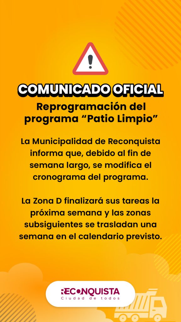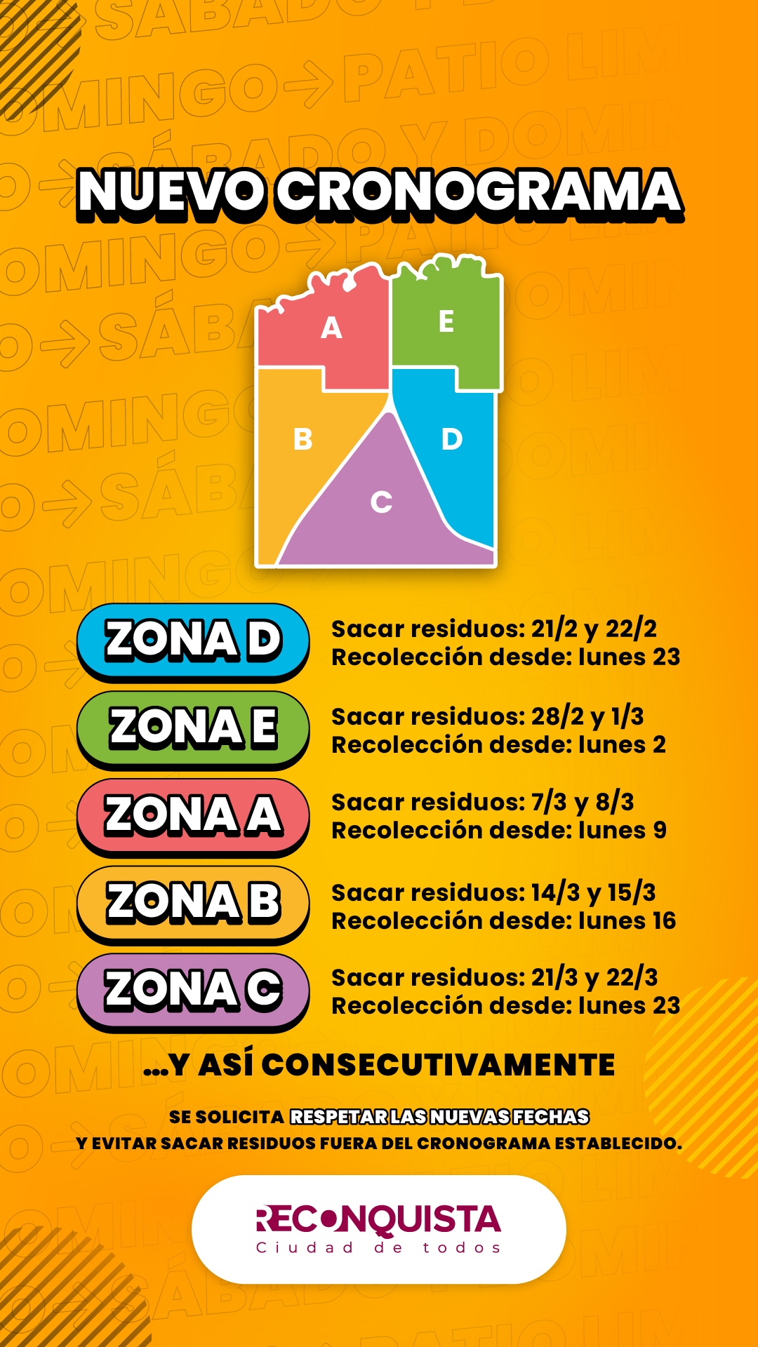 La Municipalidad informa a la comunidad que, en virtud del fin de semana largo que incluyó los feriados del lunes y martes recientemente pasados, y las medidas de fuerzas anunciadas para el día jueves 19 de febrero, se ha dispuesto la readecuación del cronograma del Programa Patio Limpio.