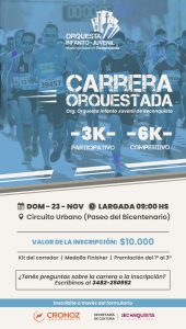 Este miércoles 19 de noviembre de 2025 entrevistamos en nuestro programa radial a Yamila Quarín y Juan Pablo Gauna profesores de música de la Orquesta Infanto-Juvenil de la Municipalidad de Reconquista quienes convocaron a todos los que quieran participar de esta novedosa iniciativa. “Nosotros somos profes de la orquesta, trabajamos con alumnos menores de edad que tocan instrumentos que son violines, flautas, clarinetes, trompetas, percusión, violonchelos y bueno, surgió la idea de hacer a beneficio de la orquesta una carrera de pedestrismo y vamos a ubicar a los alumnos durante el recorrido que van a hacer los corredores tocando instrumentos“, explicó Quarín.