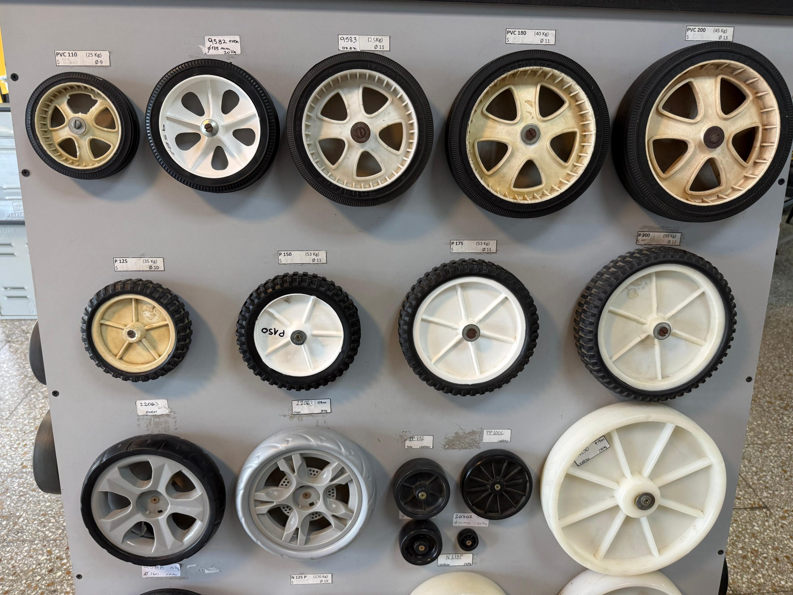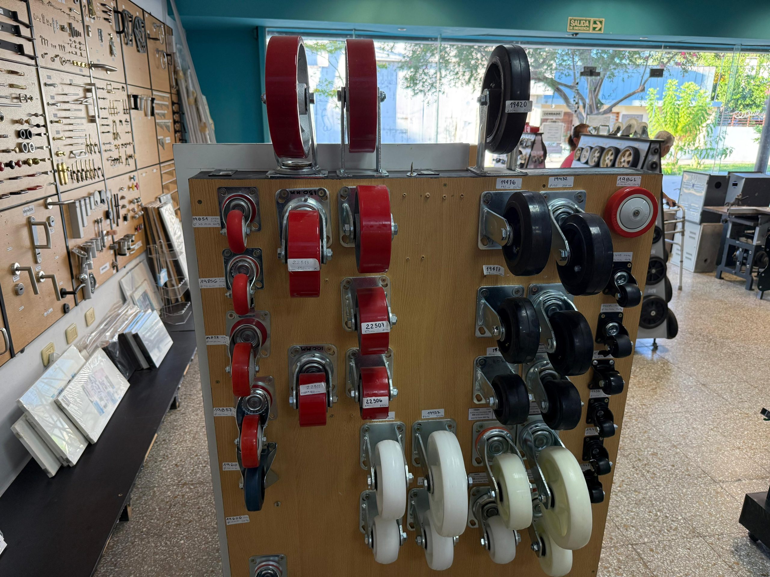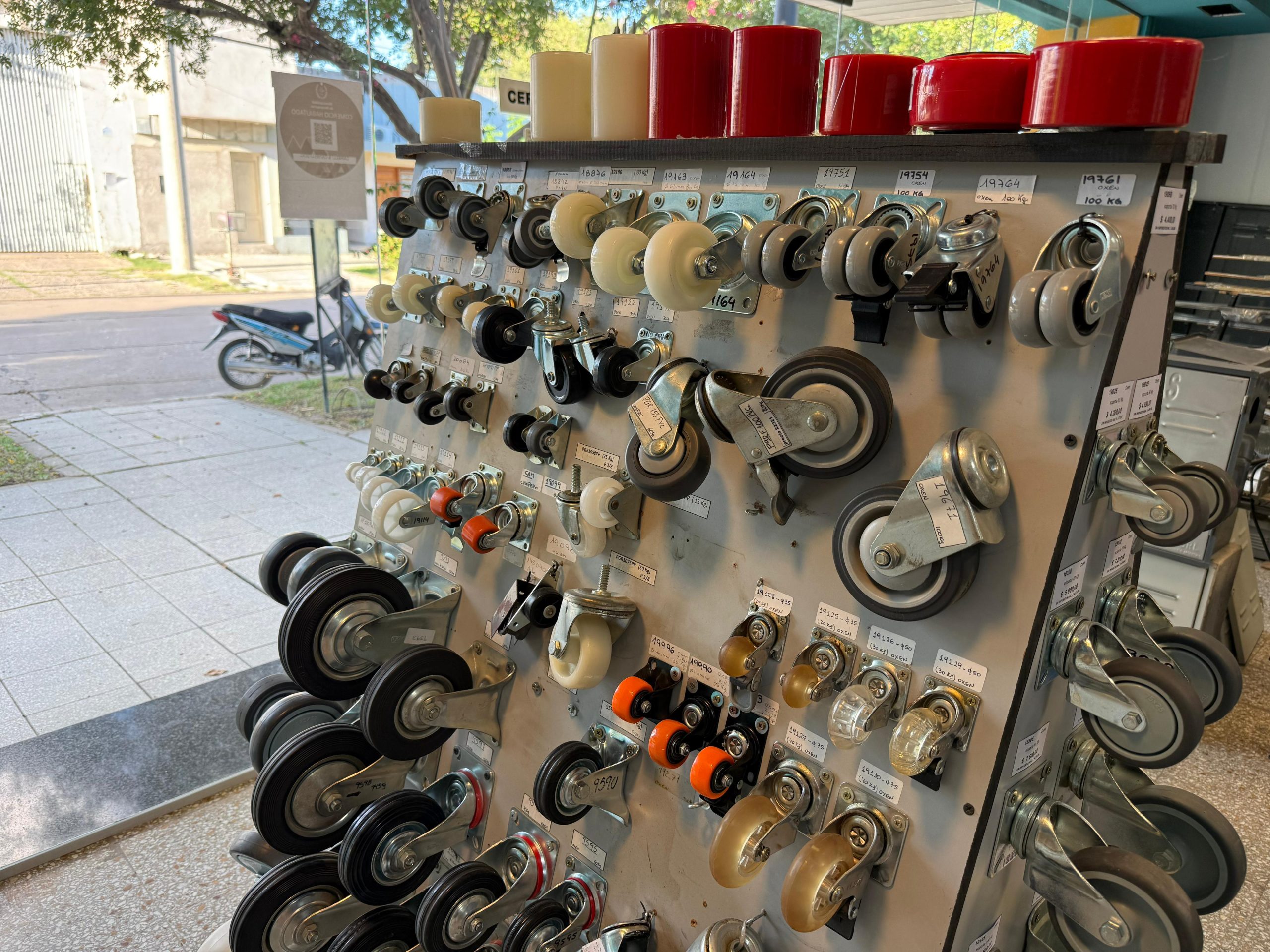 Uno de los sectores más destacados dentro de la herrajería es el de ruedas y rodajes, donde la variedad es clave. La empresa cuenta con ruedas de distintos diámetros —110, 120, 150 y 200 milímetros, entre otros— y en múltiples materiales: