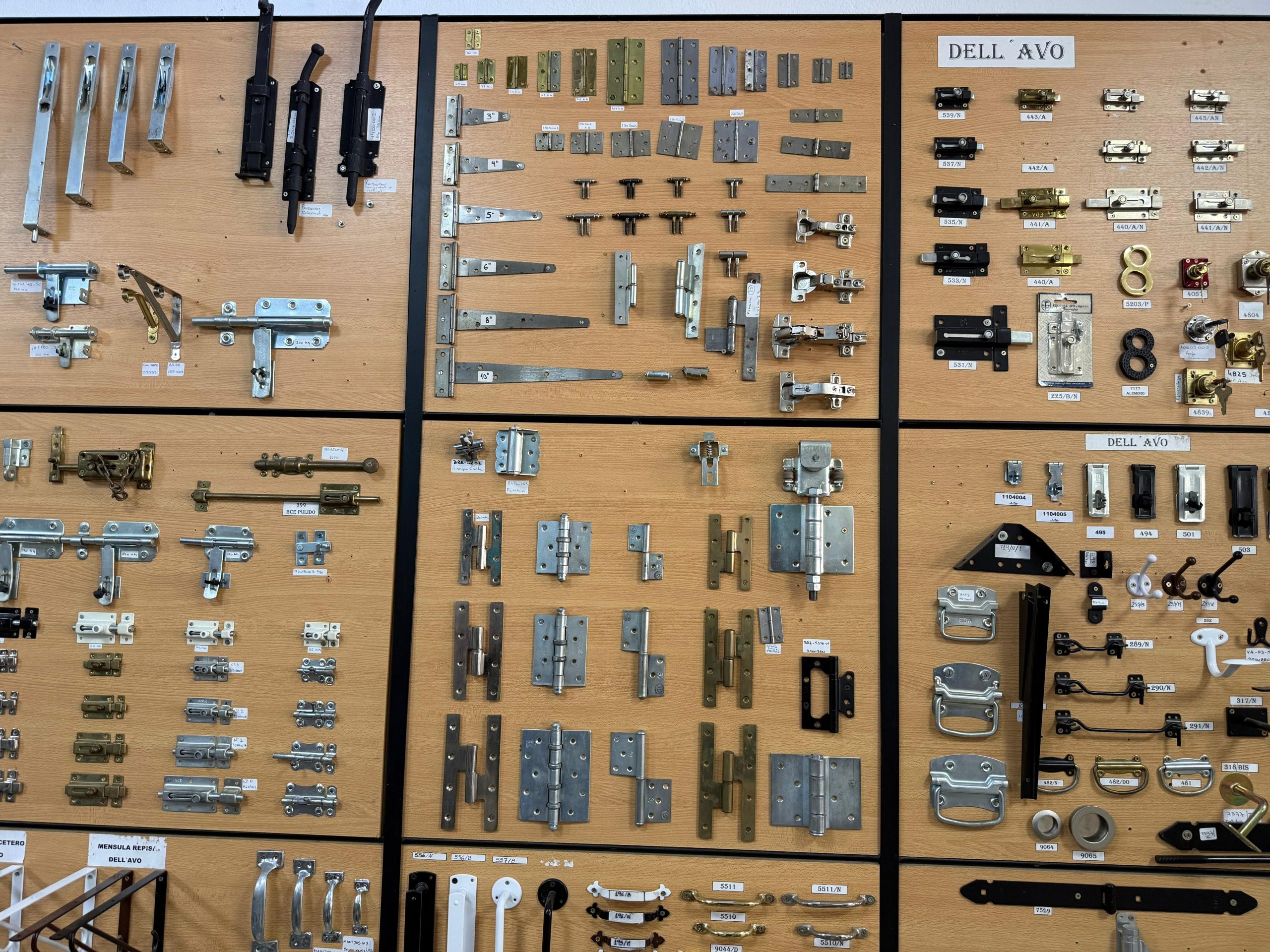 En el sector de herrajes, la oferta es igual de amplia. Hay distintos tipos de bisagras para puertas y portones —de madera, metálicos o corredizos—, así como modelos reforzados de fundición para estructuras más pesadas.