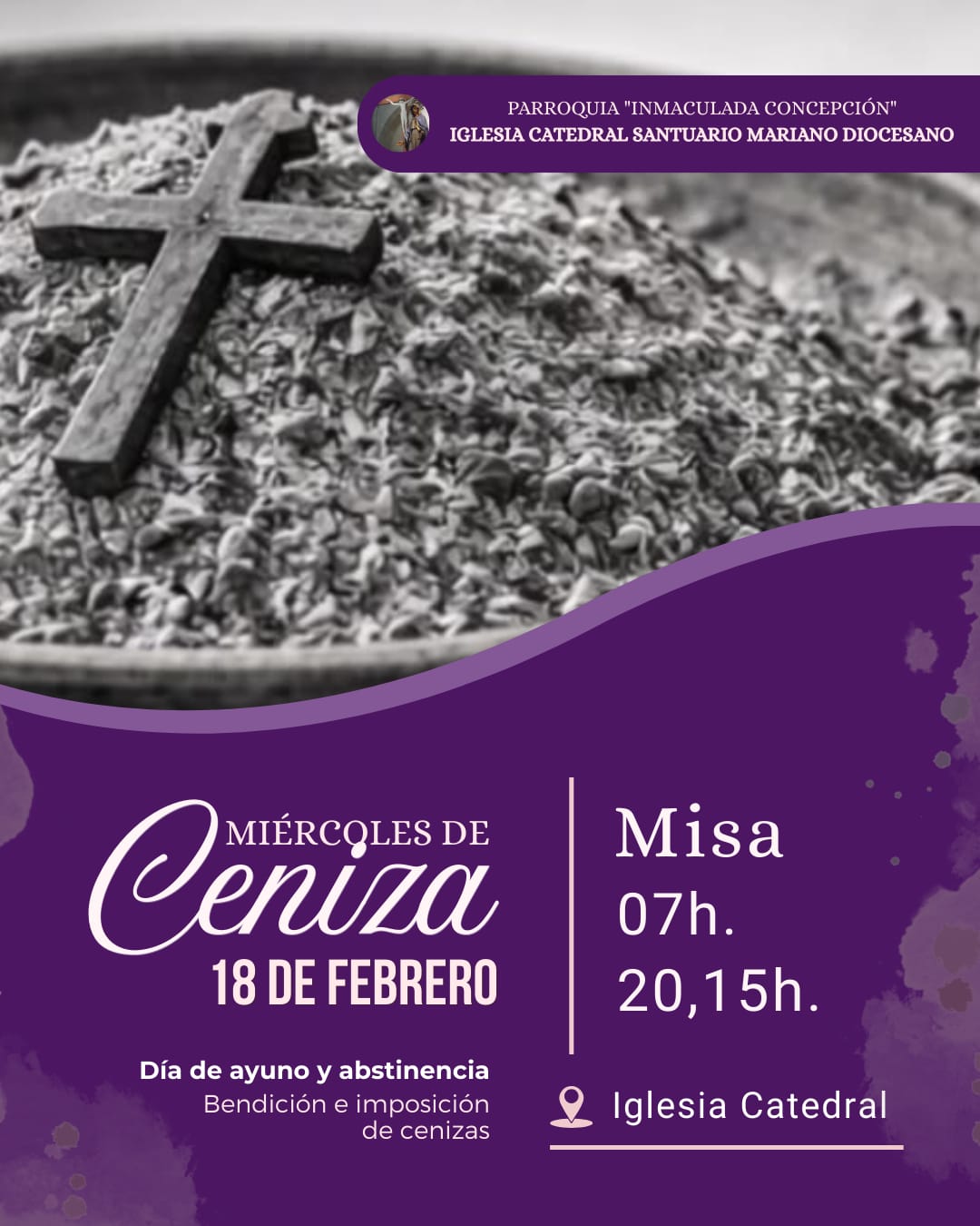 La Parroquia “Inmaculada Concepción” – Iglesia Catedral Santuario Mariano Diocesano invita a la comunidad a participar del Miércoles de Ceniza, que se celebrará este 18 de febrero, jornada que marca el inicio del tiempo litúrgico de Cuaresma.