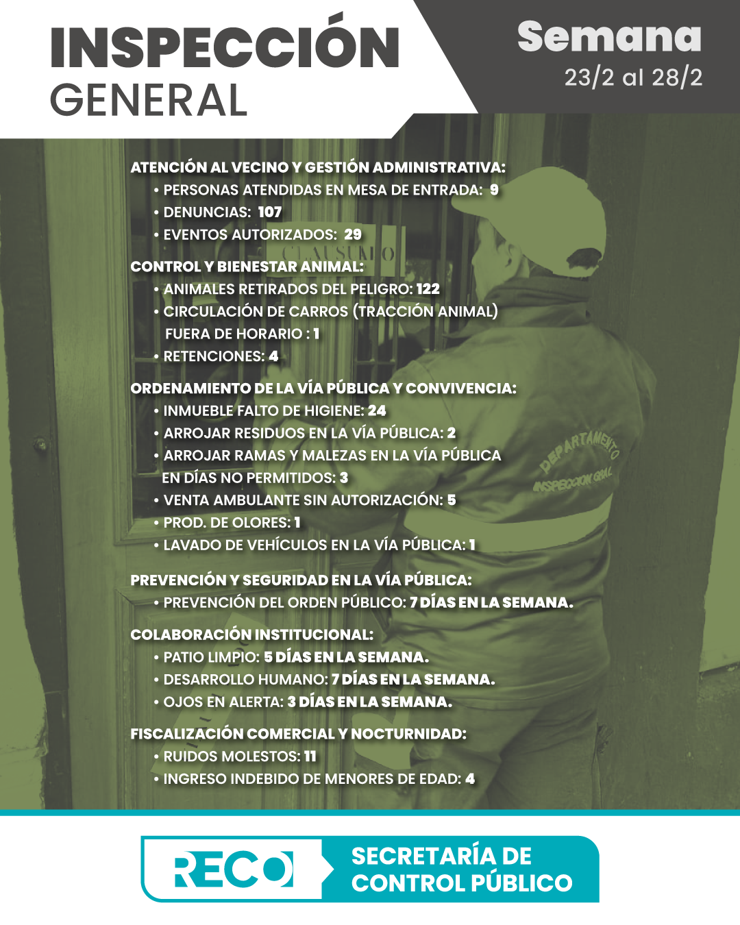 La Secretaría de Control Público informa los resultados de los controles realizados durante la semana del 23 de febrero al 1 de marzo: