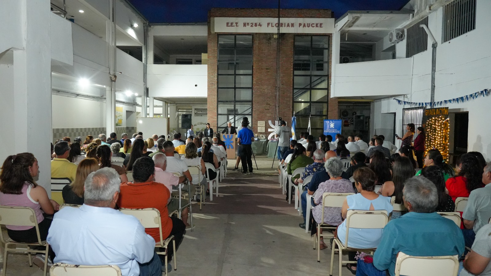 El evento incluyó reconocimientos, discursos institucionales, un video sobre el recorrido de la extensión áulica, el juramento profesional y palabras de una egresada, finalizando con agradecimientos a instituciones educativas, empresas y docentes que contribuyeron a la formación de los estudiantes