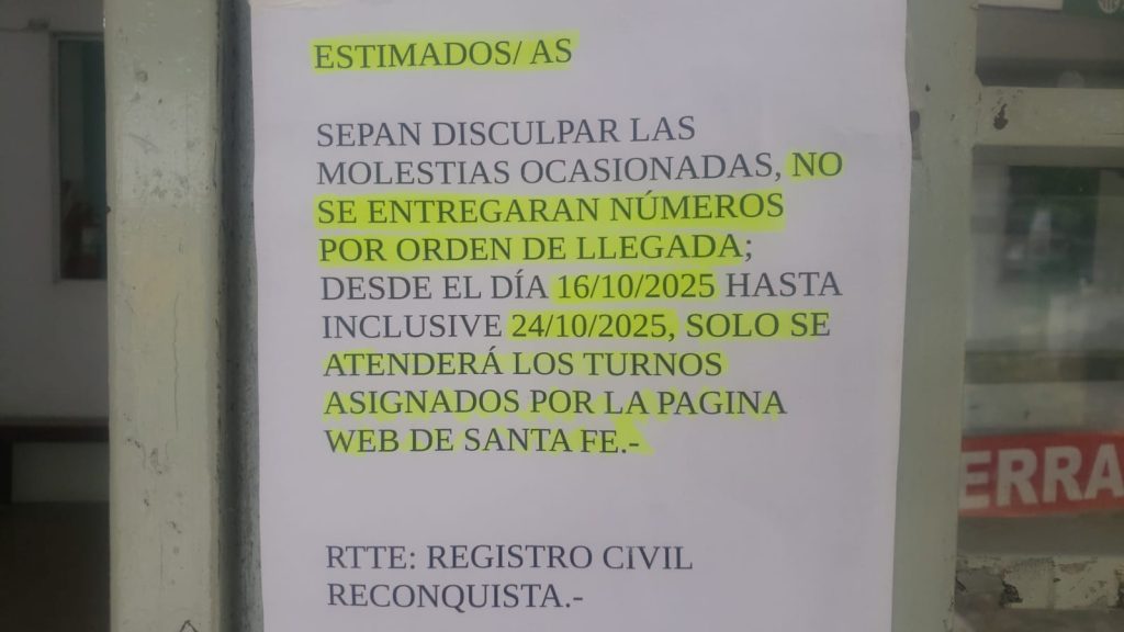 El Registro Civil de Reconquista informó que, desde el jueves 16 hasta el viernes 24 de octubre de 2025, no se entregarán números por orden de llegada.