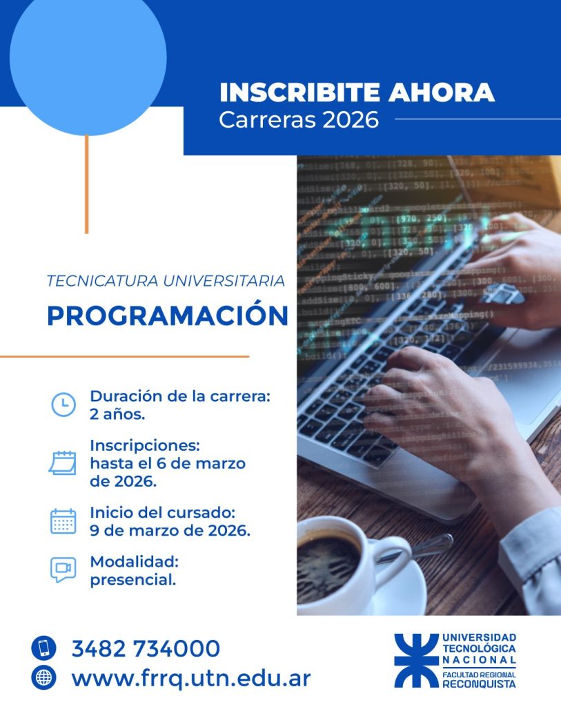 La Universidad Tecnológica Nacional (UTN) Facultad Regional Reconquista anunció todos los detalles del período de inscripciones para el ciclo lectivo 2026. La institución cuenta actualmente con más de 3.000 estudiantes entre sus carreras presenciales, a distancia y de posgrado, consolidándose como una de las principales opciones de educación superior en el norte santafesino.