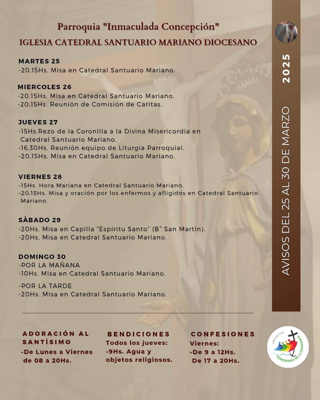 La Parroquia “Inmaculada Concepción” Iglesia Catedral Santuario Mariano Diocesano definió el cronograma de sus misas para esta semana.