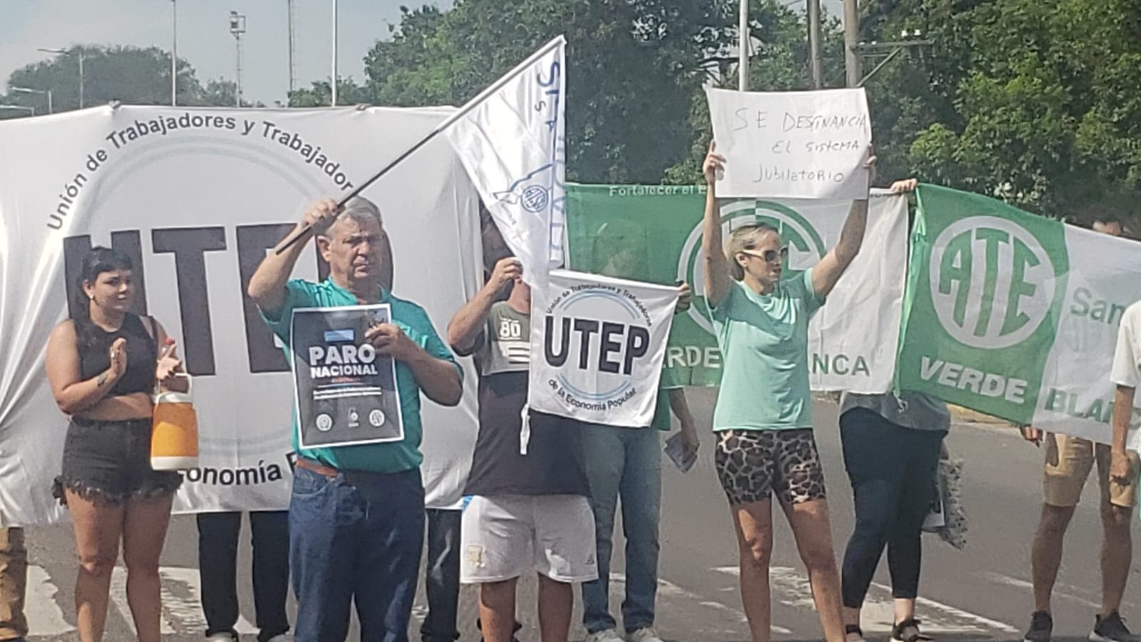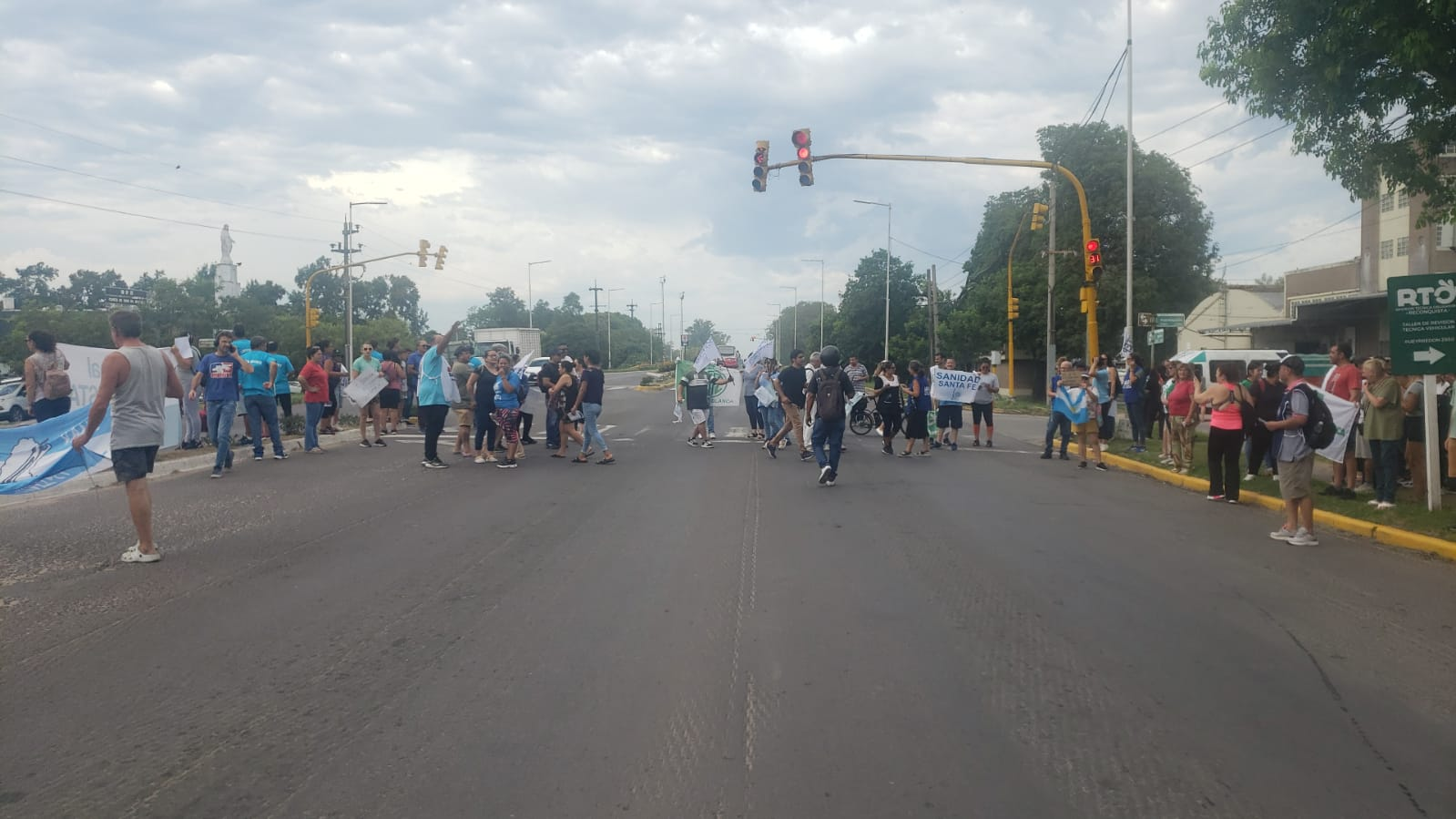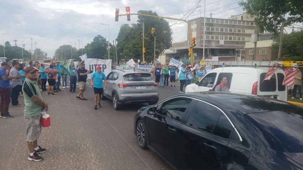 La protesta tiene lugar sobre bulevar Yrigoyen, frente al Centro Cívico, donde los manifestantes interrumpen el tránsito en ambas manos cuando el semáforo marca el rojo. Algunos conductores expresan su apoyo haciendo sonar las bocinas.