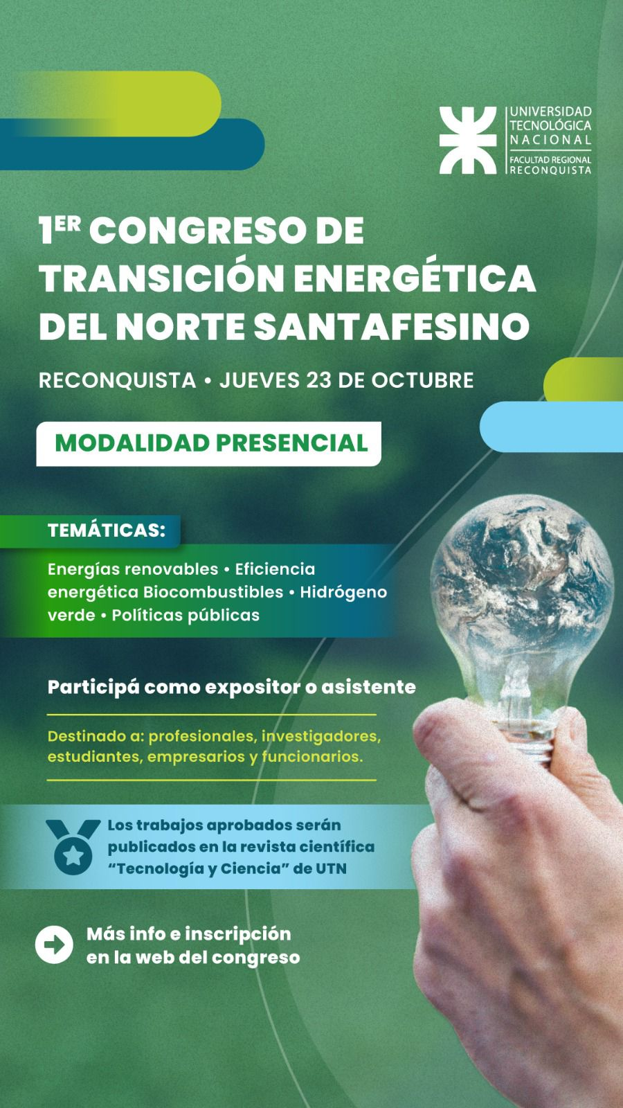 El jueves 23 de octubre se realizará en Reconquista el Primer Congreso de Transición Energética del Norte Santafesino, organizado por la Facultad Regional Reconquista de la Universidad Tecnológica Nacional.