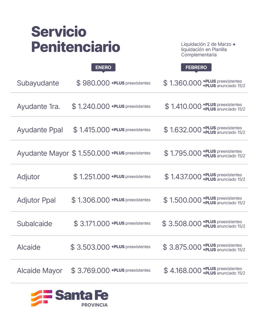 Seguidamente, Orciani utilizó algunos ejemplos para mostrar los aumentos anunciados en paritaria de febrero para la Policía y el Servicio Penitenciario: “Un suboficial de Policía que recién ingresa a la fuerza en enero cobró $ 980.000 más los plus preexistentes, mientras que en febrero percibió $ 1.360.000 y percibirá los plus preexistentes más los plus que se originan en virtud de los anuncios del gobernador Maximiliano Pullaro (el pasado 15/02), es decir, el plus operativo de calle y el plus de chofer”. En tanto que un subdirector de Policía que en enero cobró $ 4.360.000 más los plus preexistentes, en febrero percibirá $ 4.824.000 sumado a los plus preexistentes y los plus anunciados el 15 de febrero.